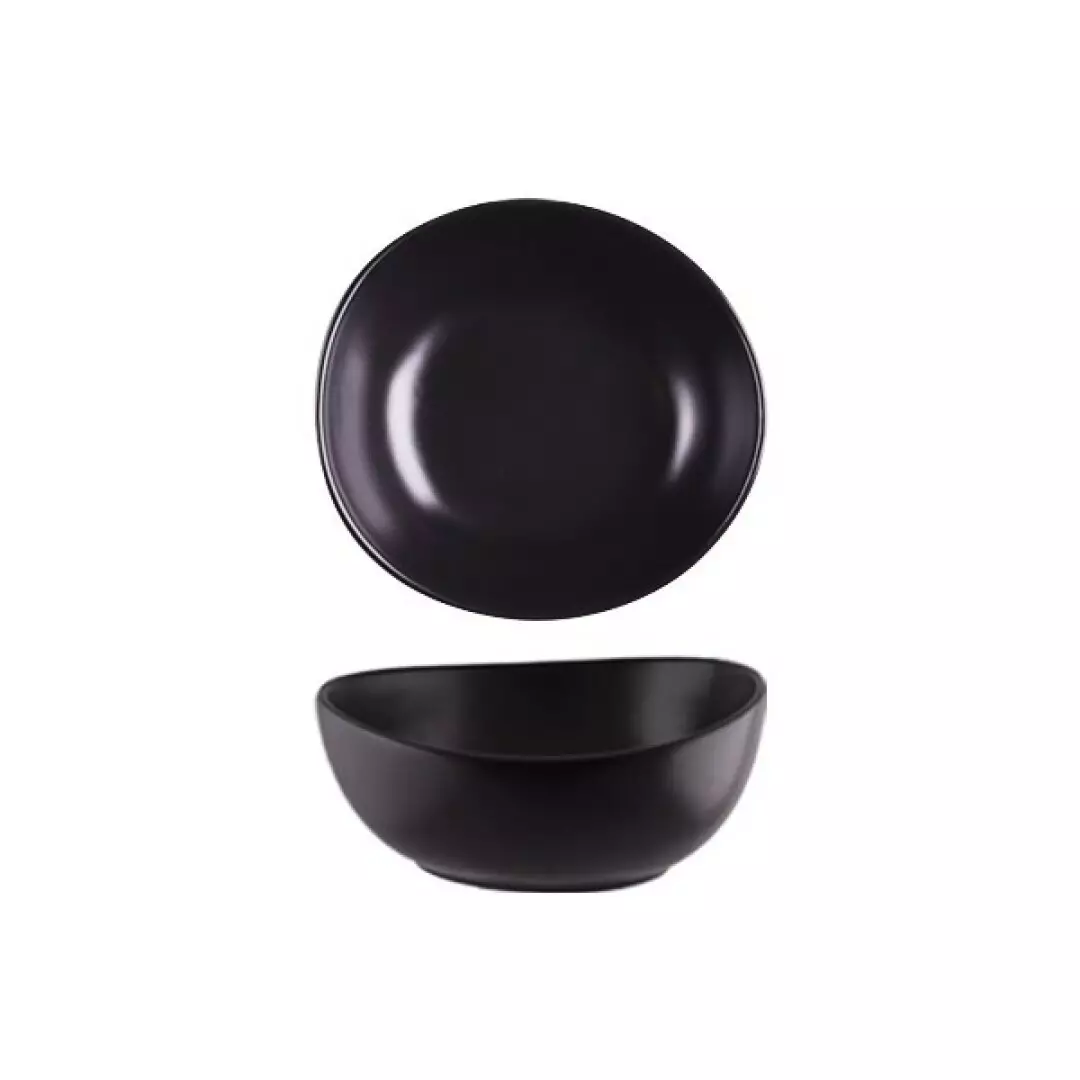 Musta reilunkokoinen soikeahko posliininen salaattikulho.