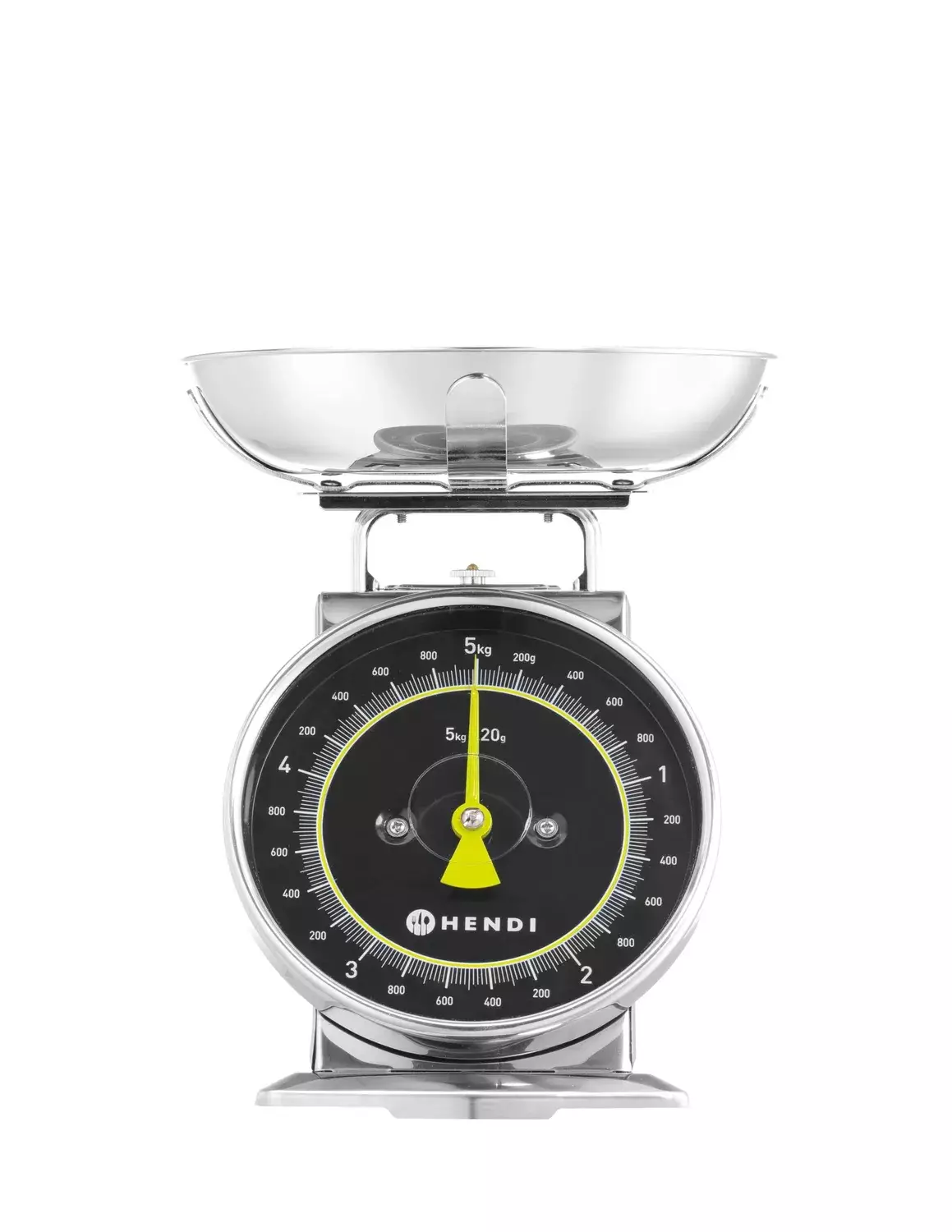 HENDI Mechanical kitchen scale on mekaaninen keittiövaaka, joka sopii käyttöön, jossa arvostetaan kestävää rakennetta ja yksinkertaista toimintaa. Vaaka punnitsee enintään 5 kg asti ja näyttää painon selkeältä analogiselta asteikolta ilman paristoja. Taaraustoiminto helpottaa arkea, kun ainekset voi punnita suoraan kulhossa.