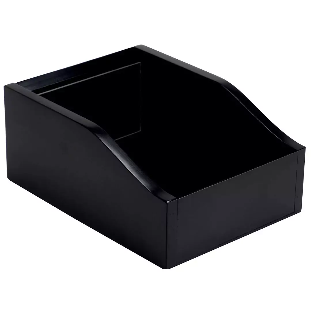 Suomessa valmistettu mustaksi värjätty puinen laatikko ruokailuvälineiden esille laittoon.