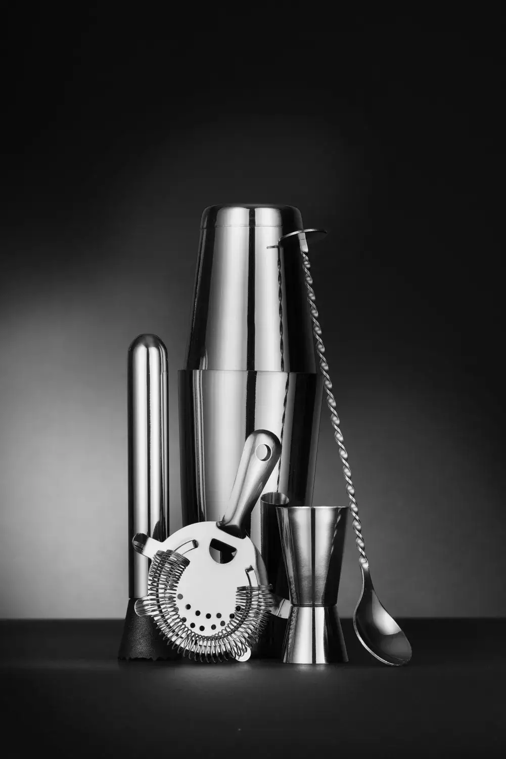 Settiin sisältyy kaksiosainen Boston shaker (500 ml ja 800 ml), perinteinen mitta (25 ml ja 50 ml) ja Hawthorne-siivilä irrotettavalla jousella. Siivilä suodattaa tarkasti jääpalat, hedelmät ja yrtit ja istuu shakeriin tiiviisti.