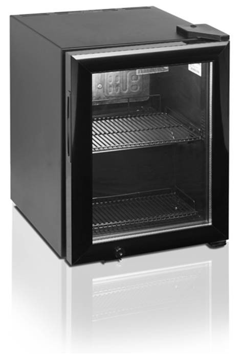 Tämä lasiovellinen myyntikylmäkaappi ei vaadi paljon tilaa, mutta siinä säilytät näkyvästi ja helposti juomia tai elintarvikkeita. Pienen kokonsa ansiosta laite on helppo sijoittaa melkein minne tahansa, mm. kahvilan seinustalle tai pöytätasolle. Väriltään laite on musta ja siinä on vakiovarusteena led-valaistus, itsestään sulkeutuva ovi sekä lukko. Laitteessa on tehokas puhallinjäähdytys ja alla säätöjalat. Vedin on integroitu oven kehykseen.