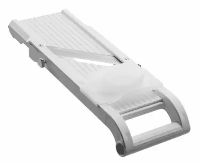 Ensiluokkainen Japanilainen mandoliini, joka leikkaa vihannekset ja juurekset ohuiksi viipaleiksi tai suikaleiksi. Suora terä on käsin hiottu ja siinä on portaaton säätö 0,5 - 8 mm. Mandoliinissa on kolme vaihdettavaa terää suikalointia varten sekä käytännöllinen sormisuoja. Alla on liukumaton pehmuste käytön helpottamiseksi. Mitat: 37 x 13 x 5 cm. Terän leveys 9,5cm.