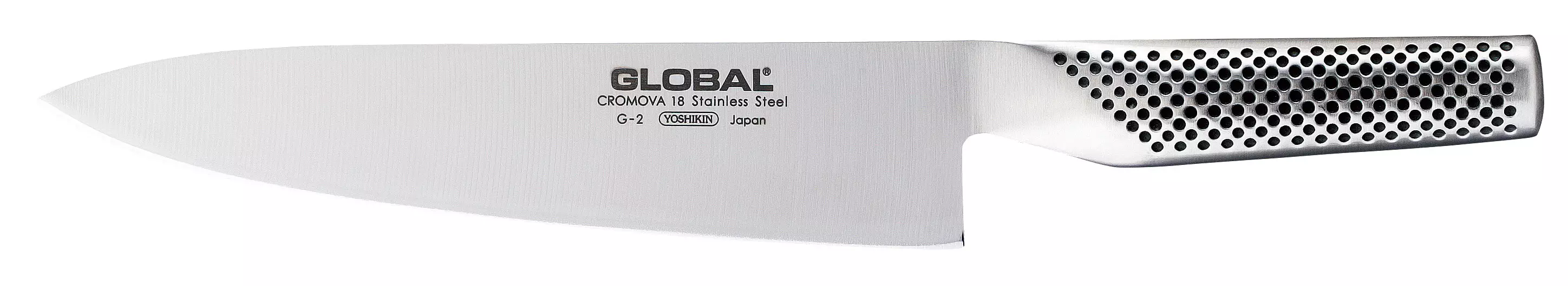 Global G-2 kokkiveitsi on keittiön monikäyttöinen työkalu. Se soveltuu leikkaamiseen, pilkkomiseen ja kuutiointiin lähes kaikille raaka-aineille. Terän paino helpottaa työskentelyä erityisesti suurten lihapalojen ja juuresten kanssa.