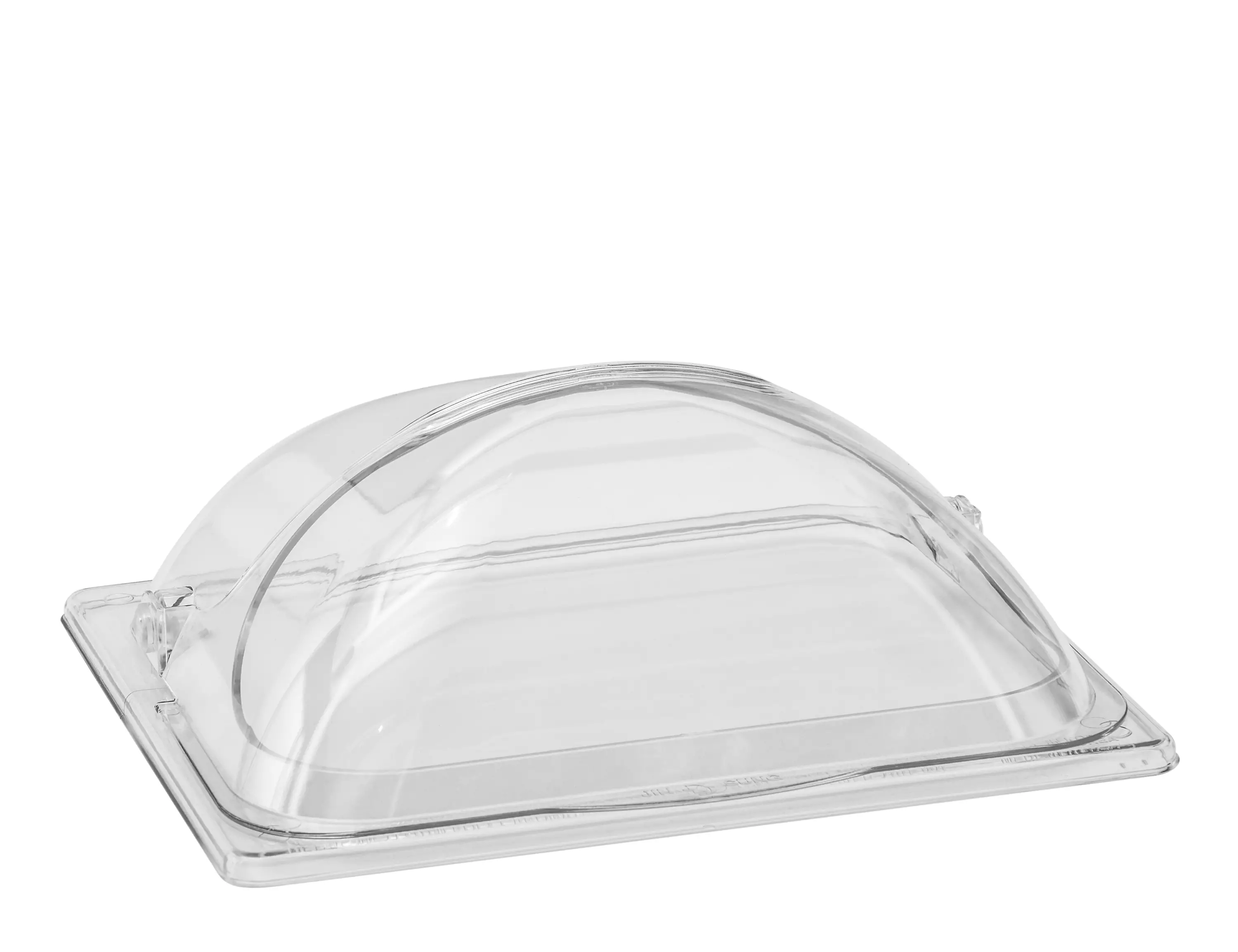 Polykarbonaatista valmistettu pidemmältä sivulta aukeava rolltop kansi GN 1/2. 33x26,5x17,5 cm.