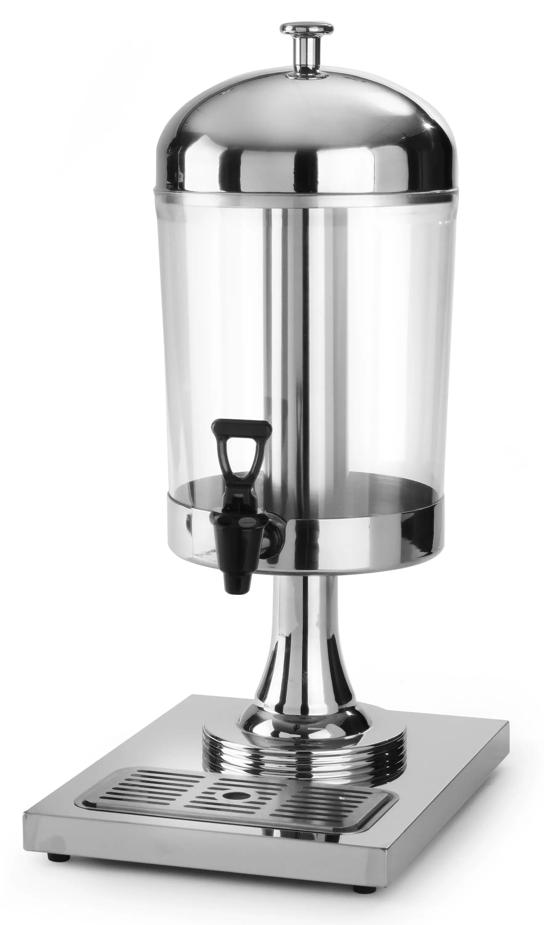 8L juoma-annostelija hanalla teräksisellä jalustalla. Jalustassa irroitettava tippa-astia. Polycarbonaatista valmistetun säiliön sisällä irroitettava teräsputki juoman kylmänä pitämiseksi.
