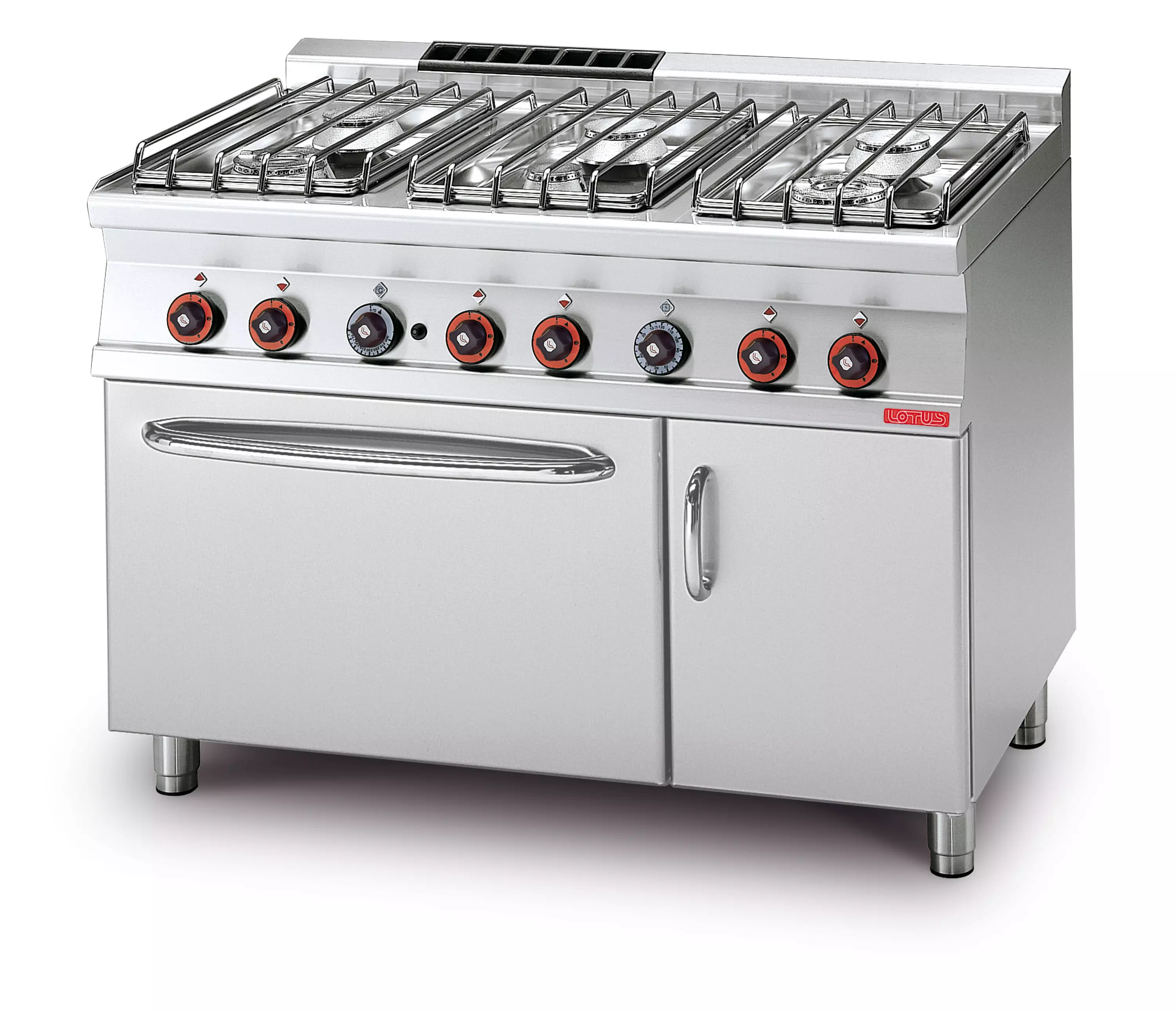 Kaasuliesi kuudella polttimella, kaasu-uunilla ja kaapilla. Kaasu-uunin koko GN2/1. Liedessä pilot light-sytytys, uunissa piezo-sytytys.