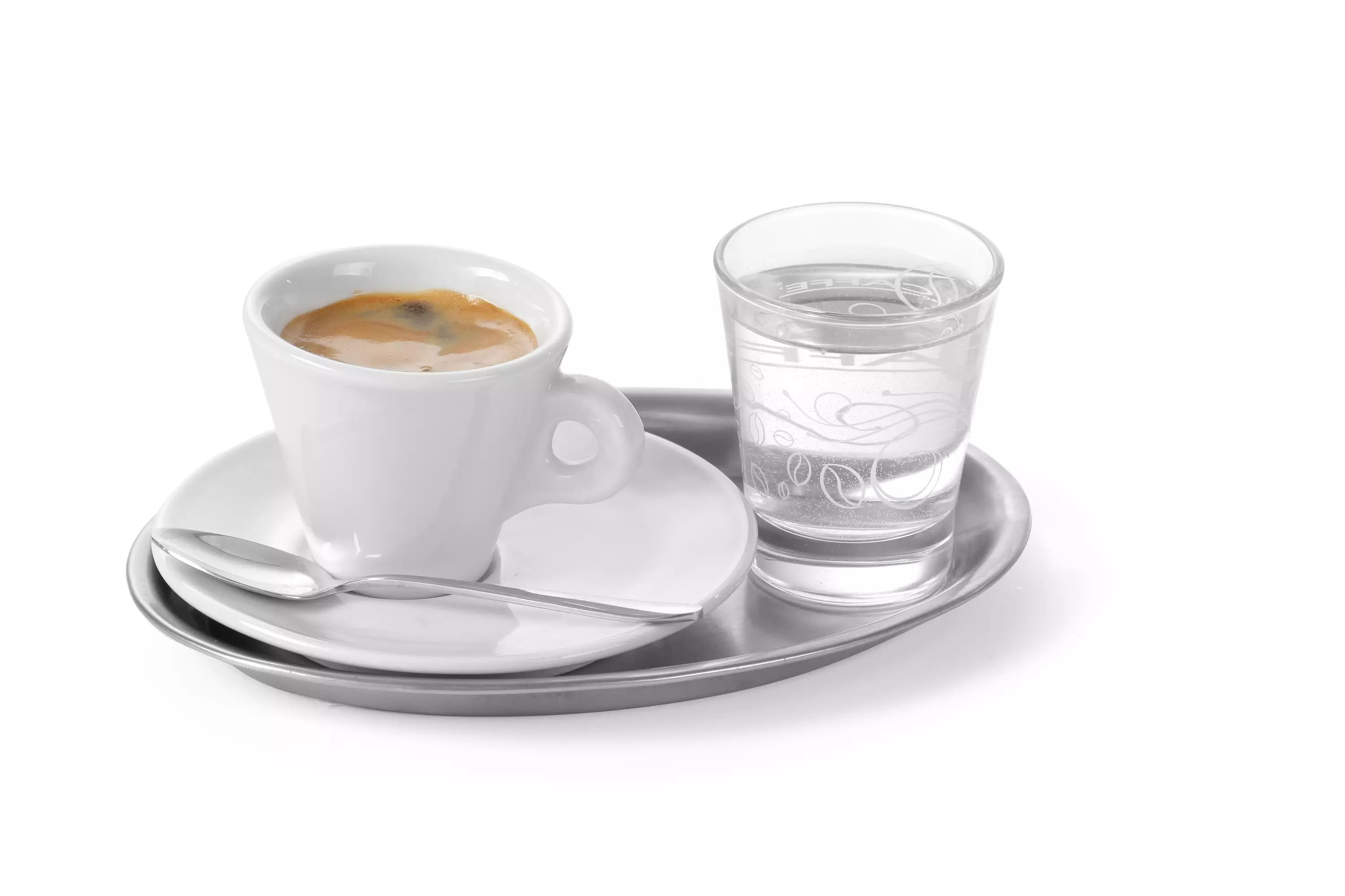 Ruostumattomasta teräksestä valmistettu ovaalin muotoinen kahvitarjotin.