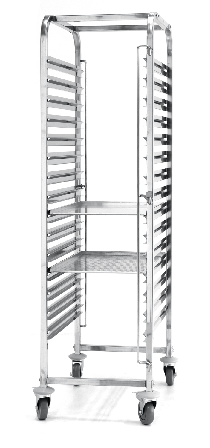 Kasattava 15 johteinen teräksinen johdevaunu 600x400mm leipomopelleille. Johdeväli 80mm. Renkaista 2 on lukittavia. Mitat: 690x515x1698mm. Toimitetaan osina.