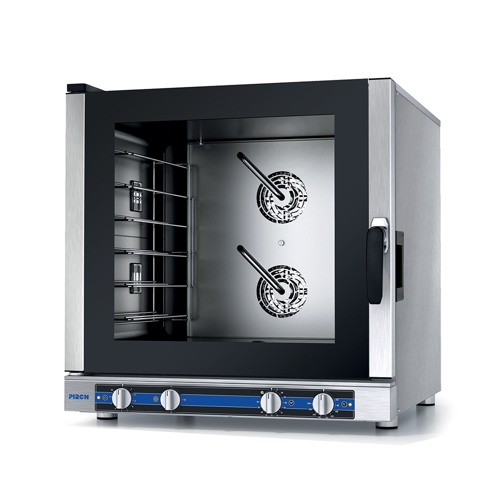 Piron Galilei PF8406 on perus kiertoilmauuni ilman turhia lisävempaimia. Selkeät manuaali vääntimet ei vaadi tietoteknistä osaamista. Uunissa 6 GN1/1 / 600x400 johdetta. Johdeväli 80mm. Kaksi suuntaavaihtavaa kolme nopeuksista puhallinta antaa tasaisen paistotuloksen. Kostutustoiminto ja ajastin.