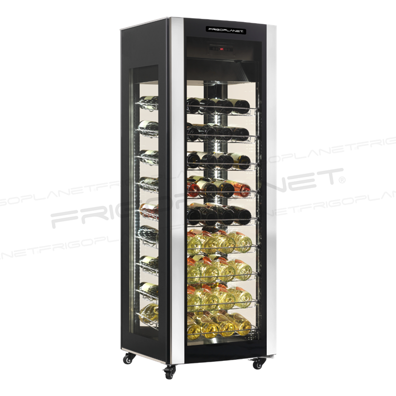 Ravintolasi saa uuden ilmeen AK400WLUX viinikaapilla. Moderni ja tyylikäs viinikaappi tarjoaa paitsi näyttävän esillepanon myös huipputason säilytysteknologian viineillesi. Sen huolellisesti suunniteltu rakenne yhdistää teräksen, lasin ja muovin kestävyyden ja esteettisyyden, varmistaen samalla parhaan mahdollisen esillepanon. Teräs, lasi ja muovi – Kestävyys ja tyylikkyys AK400WLUX viinikaapin ulko- ja sisärakenne yhdistää korkealaatuisen teräksen, lasin ja muovin, luoden vankkaa kestävyyttä ja visuaalista viehätysvoimaa. Mustaksi maalattu teräs lisää laitteen tyylikkyyttä, samalla kun tukeva rakenne takaa pitkän käyttöiän. Viimeisintä teknologiaa edustavat ominaisuudet; viinikaapin ilmankierto on suunniteltu pitämään viinisi täydellisessä lämpötilassa (+5 ÷ +18 °C), kiitos sen tehokkaan ilmastoinnin ja sisäänrakennetun jäähdytysyksikön. Digitaalinen ohjausyksikkö mahdollistaa tarkan lämpötilan säätelyn, ja kondensaatiovesi kerääntyy mukana tulevaan astiaan. Triplakarkaistut lasit jokaisella sivulla anti UV-käsittelyllä ja ovi kaarevalla lasilla. Käytännöllisyys ja mukautettavuus: yhdeksän korkeussäädettävää hyllyä ja sisäinen LED-valaistus jokaisessa nurkassa tekevät pullojen sijoittelusta ja esillepanosta vaivatonta. Pyörivät pyörät, joista kaksi on jarrullisia, takaavat kaapin helpon liikuttelun ja paikalleen lukitsemisen. Energiatehokkuus on luokiteltu energialuokkaan C. Laitteen mitat ovat 656x653x1930h mm, ja se kuluttaa 500 wattia teholla 230/1N/50. Viinikaapin kapasiteetti on 81 pulloa.
