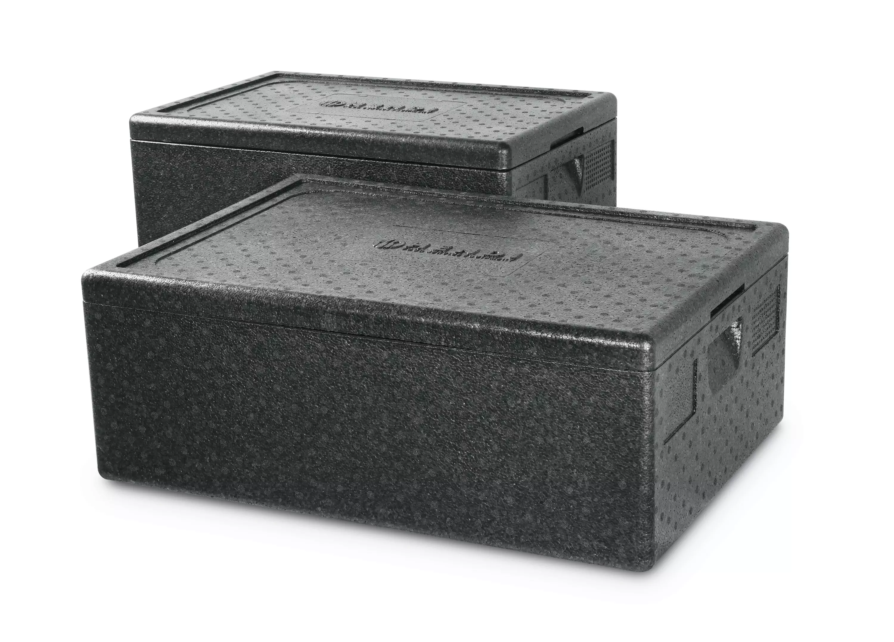 Polypropeeni vaahto EPP, musta, harmaalla tiiviillä kannella. Kahvat. Ulkomitat: 600x400x(H)285mm. Sisämitat: 538x338x(H)234mm. 40L/ GN 1/1-200.