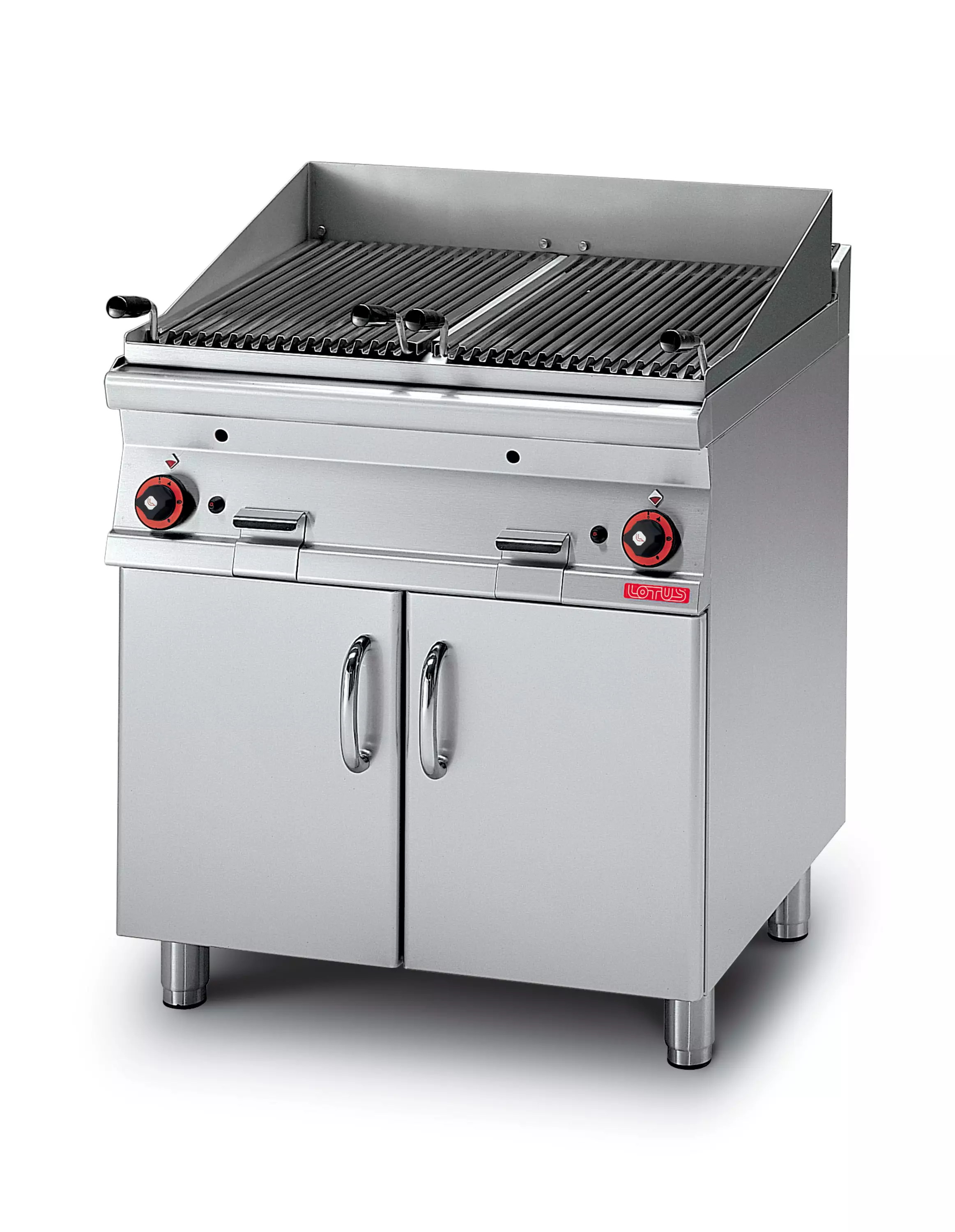 Laavakivigrilli avojalustalla, ovet eivät sisälly hintaan. Kaksi lämpoaluetta (35x52cm). Molemmille oma säädin. Valmistettu ruostumattomasta teräksestä. Irrotettava rasva-astia. Piezo ja pilot light-sytytys. Sopii neste-ja maakaasulle. Kaasu teho 18kW. Säädettävät jalat. Koko: 800x700x(H)900mm.