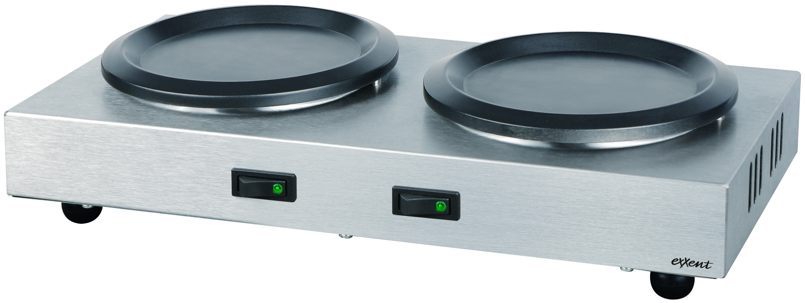 Lämpölevy 2:lle lasipannulle. Molemmille levyille oma virtakatkaisin. Mitat: 360 x 180 x 80mm. Sähkö 120W/230V.