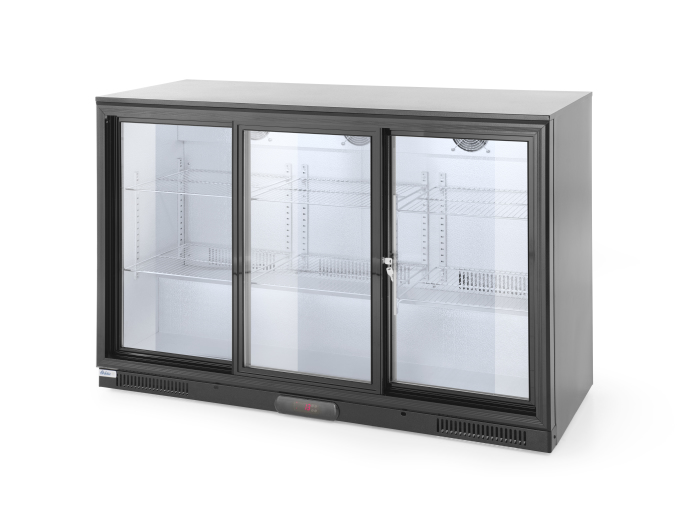 Led-valaistu matala juomakaappi kolmella liukuovella. Lukittavien ovien lasi valmistettu karkaistusta lasista. Säädettävät jalat. Kylmäaine R600a. Lämpötila-alue: 2-10°C.
