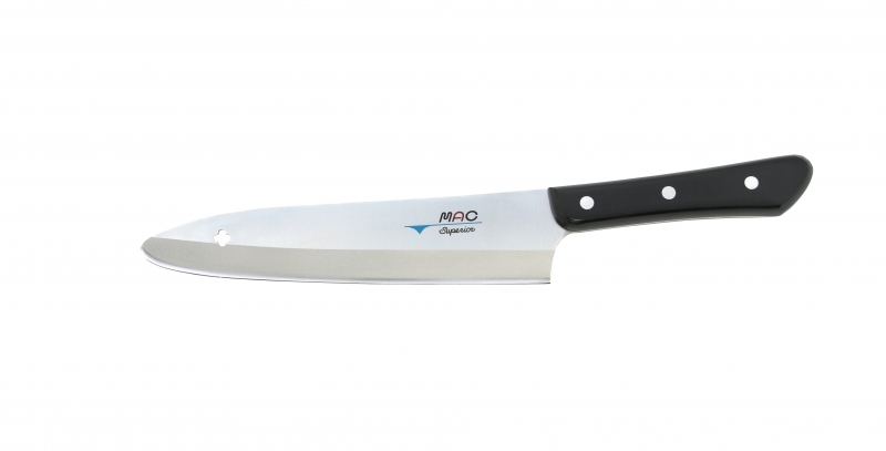 MAC Superior-sarjan 20cm pitkä kokkiveitsi. Kauttaaltaan teroitettu pyöreä kärki. Teräs on laadukasta ja ruostumatonta Molybdenum Vanadium -terässekoitetta. Veitsen teroituskulma 10 astetta.