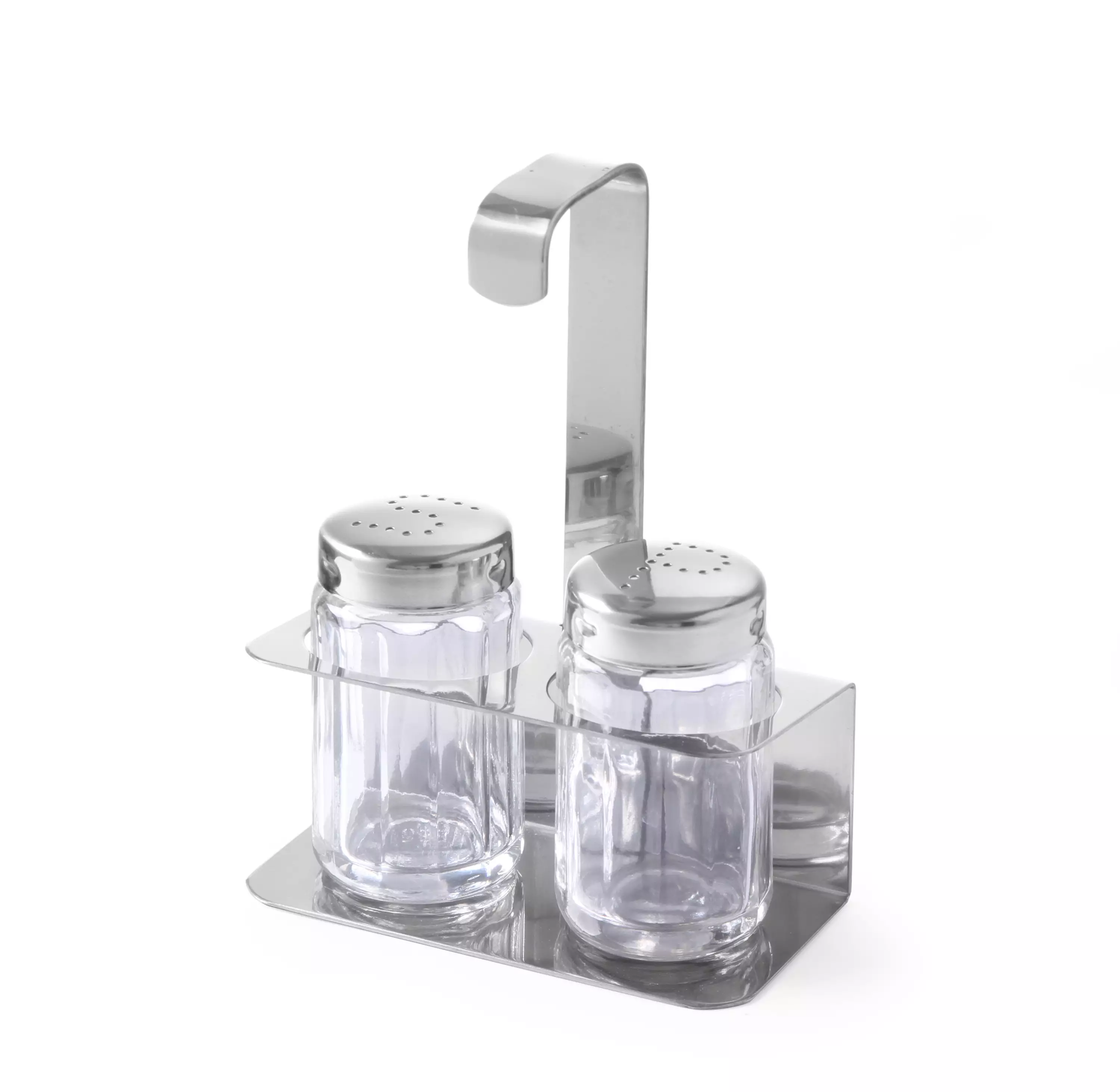 Ruostumattomasta teräksestä valmistettu kaksiosainen maustesetti, suolalle ja pippurille.