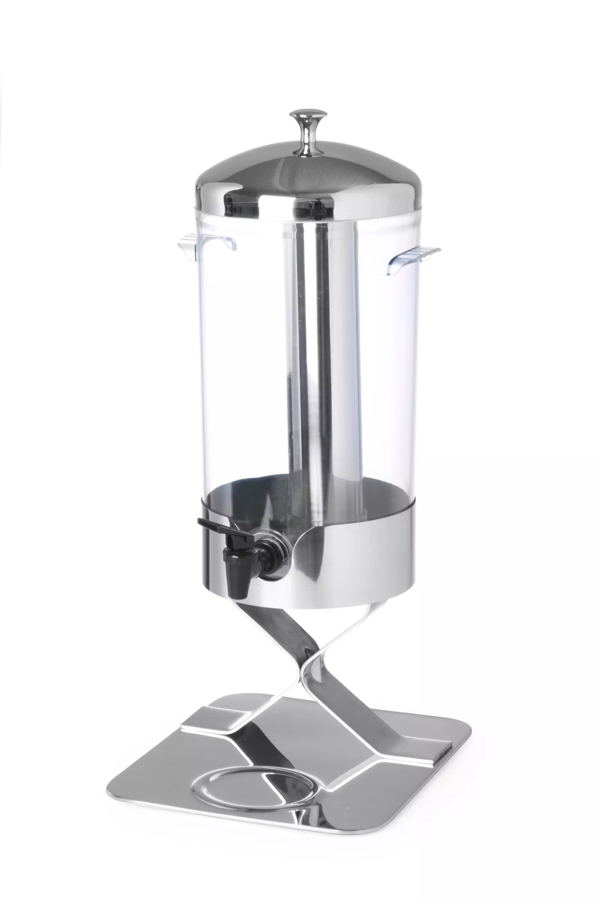 Kirkkaasta polykarbonaatista ja ruostumattomasta teräksestä valmistettu mehuannostelija. Tiputtamaton hana.