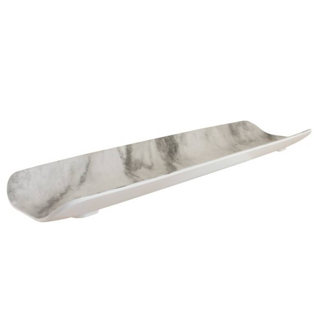 Kaareva Melamiini Tarjoilualusta Alar Carrara GN 2/4 Marmorijäljitelmä. Mitat: 53x16x4 cm. Melamiini on hygieeninen, iskunkestävä ja kevyt materiaali, joka kestää myös konepesun.