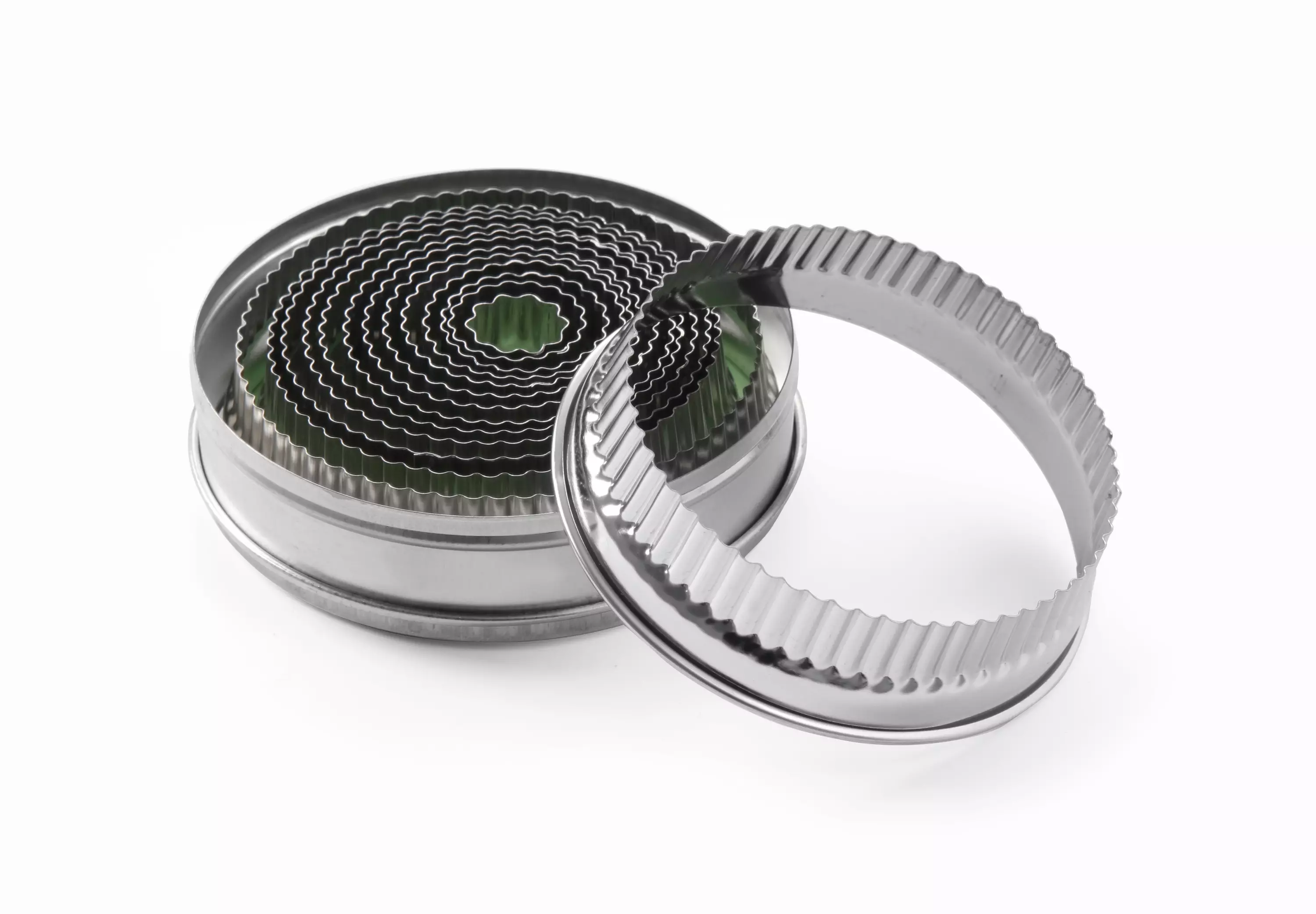 Teräksiset pyöreät muotit teräsrasiassa. 14-osaa, halkaisijat 18-108mm.