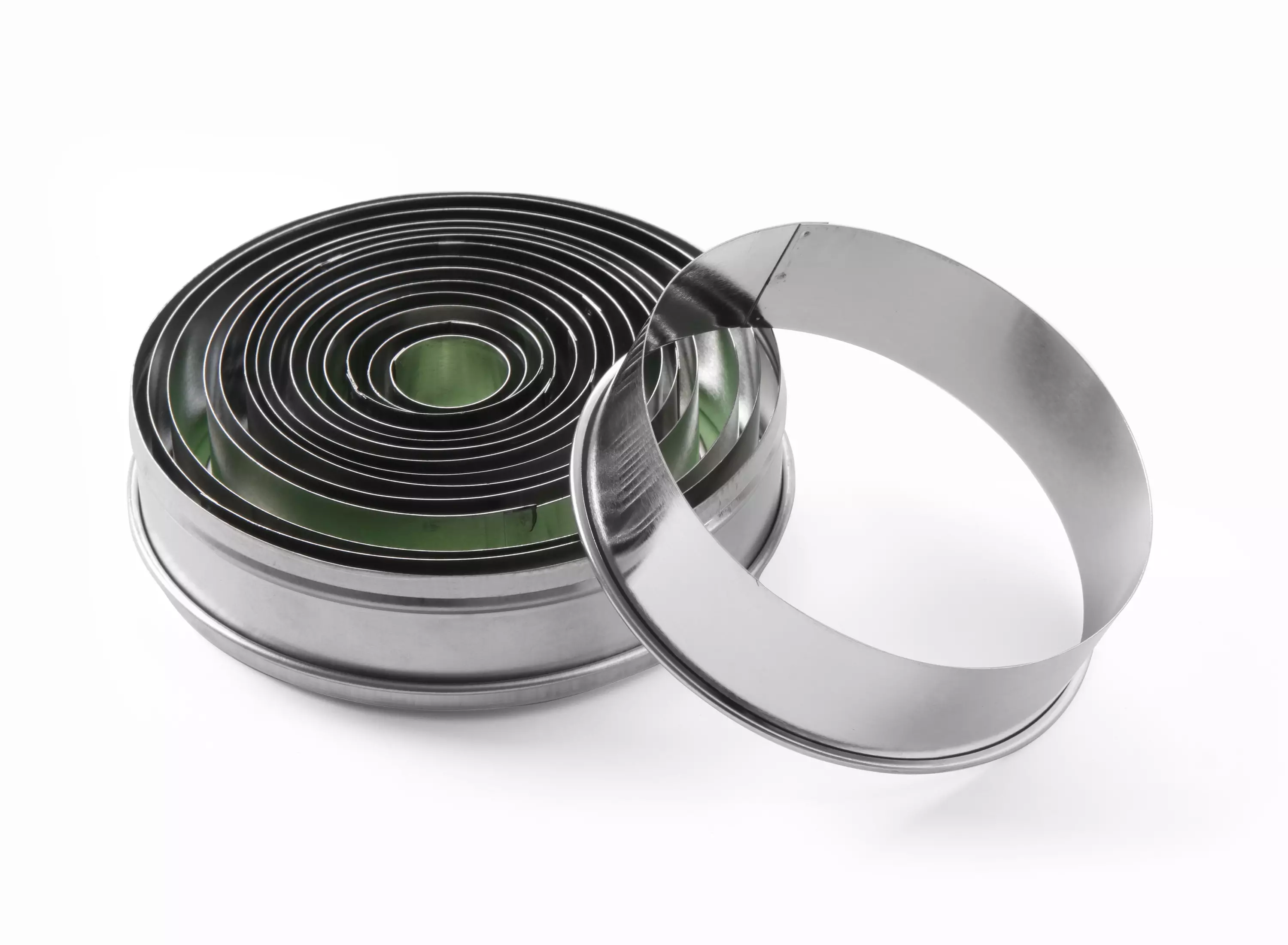 Teräksiset pyöreät muotit teräsrasiassa. 14-osaa, halkaisijat sileissä 19-112mm.