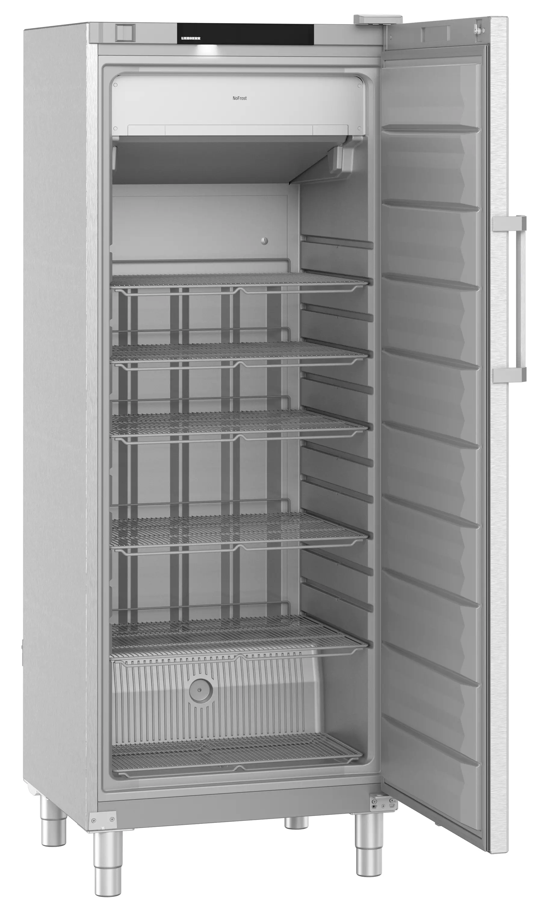 Laadukas Liebherr pakastekaappi ammattikäyttöön. Puhallin jäähdytys sekä automaattinen sulatus. Ulkopinta ruostumatonta terästä, sisäpinta helposti puhdistettavaa harmaata muovia. Electroninen säädin ja digitaalinen näyttö. Pakastekaapissa on 5 korkeussäädettävää lankaritilä hyllyä ja oikeakätinen ovi on lukittavissa ja kätisyys käännettävissä. Lämpötila- ja ovihälytys sekä ledvalo. Kylmäaine R290.