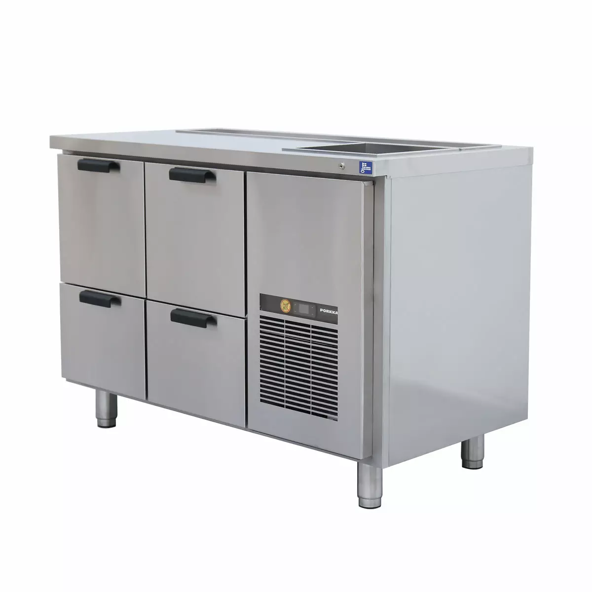 Porkan vetolaatikostoilla on 3 vuoden takuu! Tämän kalusteen kannessa on jääallas ja kallistettu jäähdytetty pullokouru, josta viini- ja viinapullot ovat helposti saatavilla ja jossa juomat säilyvät sopivassa tarjoilulämpötilassa. Varustus nopeuttaa ja helpottaa palvelua kiireisinä jaksoina. Lisäksi kalusteessa on runsaasti varastotilaa, jossa jäähdytetyt juomatäydennykset pysyvät tarkoituksenmukaisessa tarjoilulämpötilassa. Kalusteet on valmistettu korkealaatuisista komponenteista ja niiden näkyvät sisä- ja ulkopinnat sekä vetolaatikostojen laakeroidut liukukiskot ovat ruostumatonta terästä. Käyttövalmiit kalusteet ovat luotettavia, kestäviä ja pitkäikäisiä. Vetolaatikoissa ja ovissa on kannen etureunasta käytettävä keskuslukkojärjestelmä. Kalusteessa on ruostumattomat teräsjalat, joiden korkeutta on helppo säätää. Jalkojen tilalle saa vaihtoehtoisesti pyörät. Jokaisessa vetolaatikossa on irrotettava pohja ja kaapissa on hyllyt. Kalusteissa on innovatiivisia toimintoja, kuten esimerkiksi huoltoa tai korjausta helpottava kokonaan ulosvedettävä jäähdytyskasetti.
