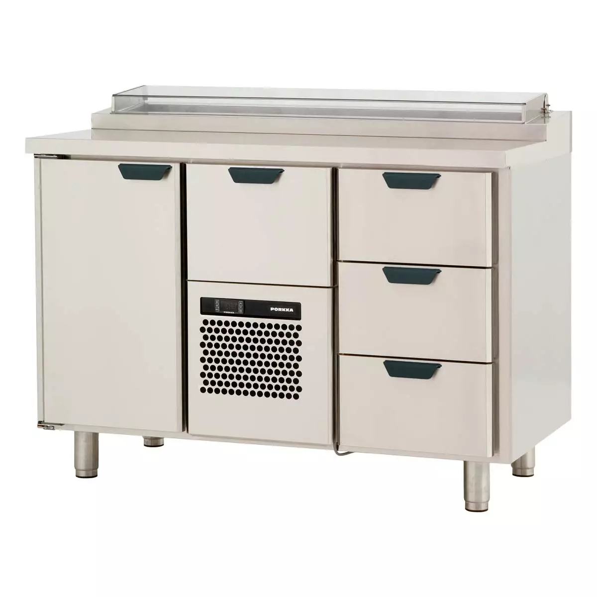Porkan vetolaatikostoilla on 3 vuoden takuu! Cold Line pizza-/kylmäköntyöpöydät ovat ihanteellisia työasemia salaattien, voileipien ja pizzojen valmistukseen. Kannen takaosassa on saranoidulla pisarasuojalla varustettu GN mitoitettu jäähdytetty allas. Kalusteet on valmistettu korkealaatuisista komponenteista ja niiden näkyvät sisä- ja ulkopinnat sekä vetolaatikostojen laakeroidut liukukiskot ovat ruostumatonta terästä. Käyttövalmiit kalusteet ovat luotettavia, kestäviä ja pitkäikäisiä. Ovissa ja vetolaatikoissa on kahva ja helposti ilman työkaluja vaihdettavat tiivisteet. Kalusteessa on ruostumattomat teräsjalat, joiden korkeutta on helppo säätää. Jalkojen tilalle saa vaihtoehtoisesti pyörät. Jokaisessa kaapissa on hyllyt ja vetolaatikoita saa myös irrotettavalla pohjalla. Kalusteissa on innovatiivisia toimintoja, kuten esimerkiksi huoltoa tai korjausta helpottava kokonaan ulosvedettävä jäähdytyskasetti. Kaapit ja laatikostot on mitoitettu sopiviksi GN1/1 kokoisille ja niitä pienemmille astioille ja vuoille.