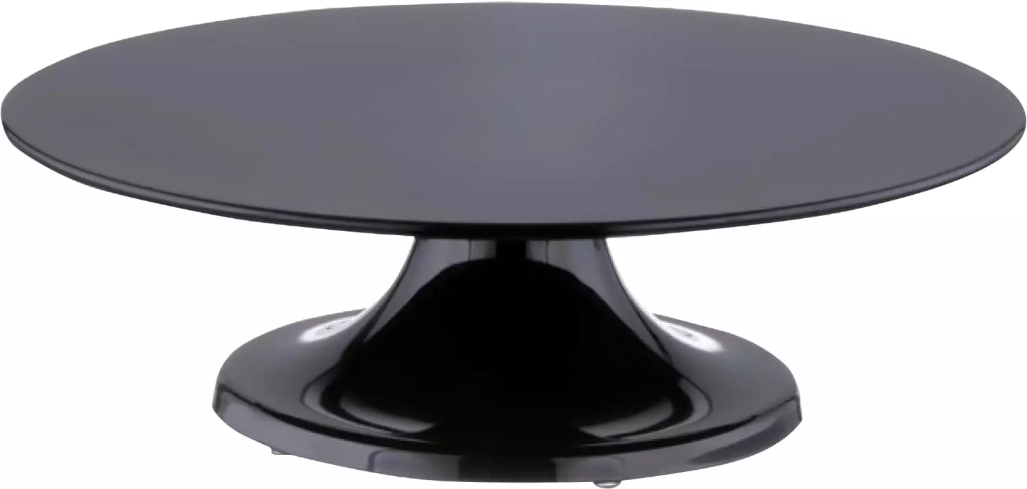 Musta melamiinista valmistettu pyöreä ja pyörivä kakkulautanen jonka halkaisija on 32cm. Korkeus 10cm. Pohjassa liukuestejalat.