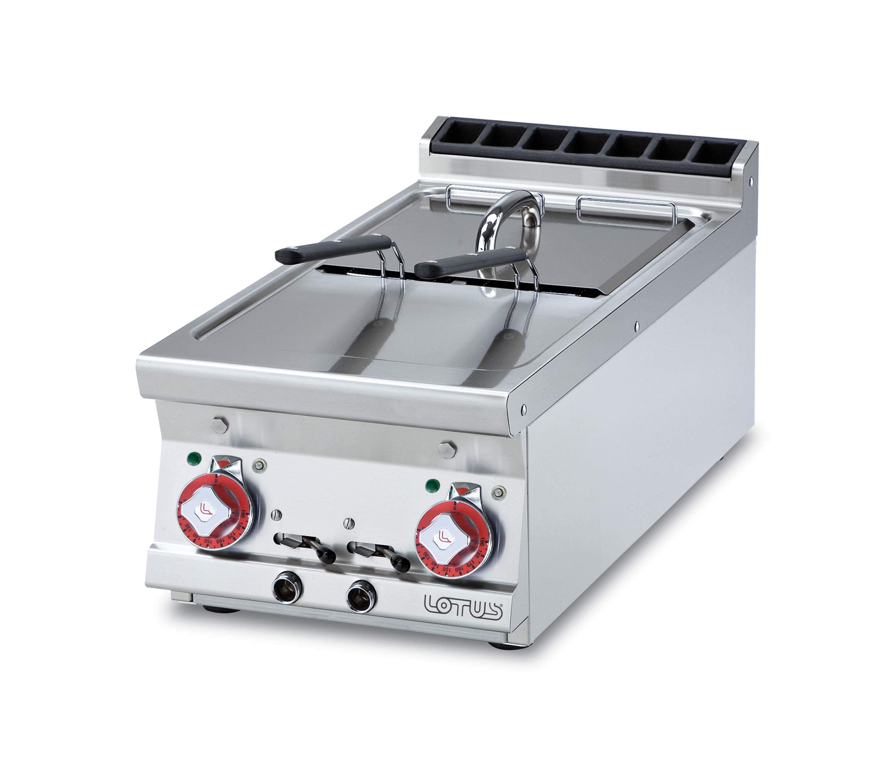 Lotuksen 70-sarjan kahdella altaalla oleva rasvakeitin. Molempien altaiden tilavuus 8L. Sähköteho: 12kW. 3N/400V. Ulkomitat: 40x70,5x28cm. Korin koko: 12x29x11,5cm.