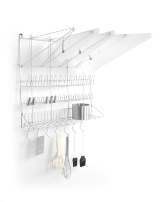 4 paikkaa pursotin pusseille, 31 paikkaa tyllille, 7 koukkua vispilöille yms ja yksi hylly.
