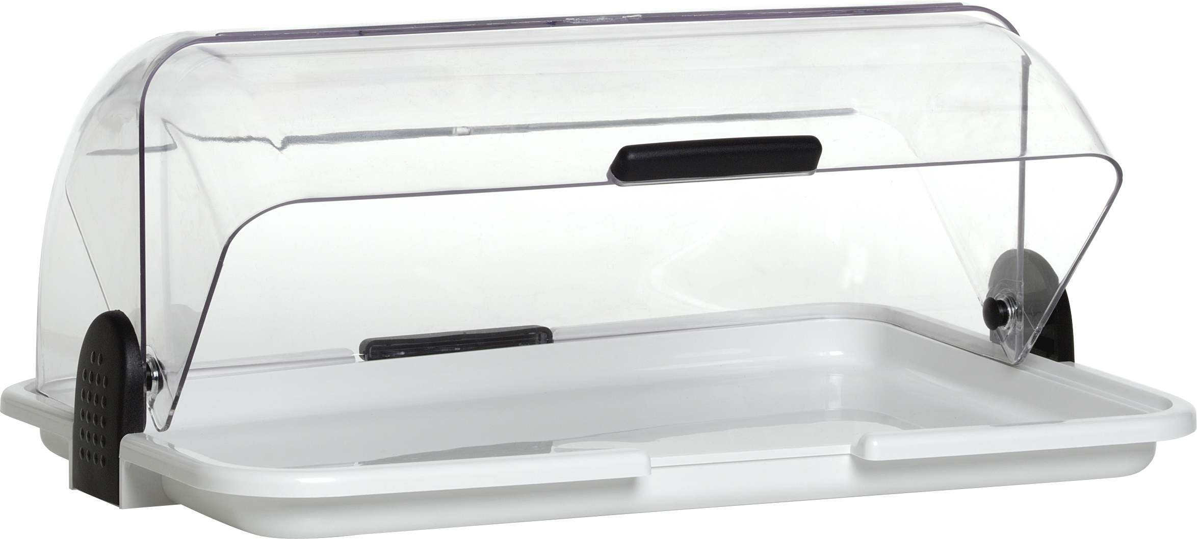 Kirkkaalla muovisella rolltop-kannella varustettu tarjotin. Kansi aukeaa molemmilta puolilta. 465x310x(H)190mm.