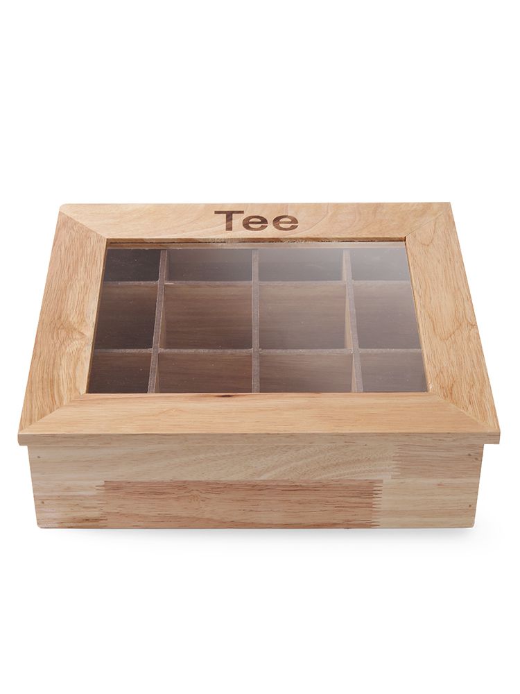 Puinen teepussien säilytyslaatikko 12 lokerolla.