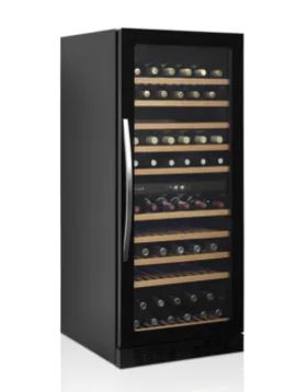 Kaksi lämpötila-aluetta, 5-10 °C & 10-18°C tummennettu lasiovi ulko- ja sisäpinnat mustat elektroninen lämpötilansäätö 10 puuhyllyä LED-valaistus säädettävät jalat oven kätisyys vaihdettavissa Kapasiteetti: 119 viinipulloa (750 ml) Kylmäaine R600a 230 V/155W Mitat: 595x680x1390 mm