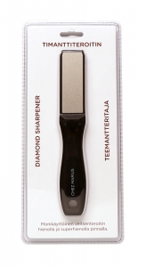 Tukevalla kahvalla varustettu kaksipuoleinen timanttilasta, jossa timanttikarkeudet 1000 / 600 dmi. Timanttipintojen koko 2,4 cm x 7,2 cm. Terottimen kokopituus 19,5 cm.