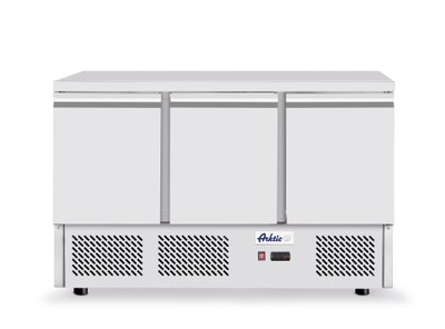 Valmistettu korkealaatuisesta ruostumattomasta teräksestä (paitsi takaulkoseinä galvanoitua terästä). Staattinen jäähdytys, puhallin. Embraco kylmäkone alhaalla. Kolmiovinen GN1/1-mitoitettu kaappi, 1 säädettävä hylly /ovi. Digitaalinen näyttö. Suunniteltu toimimaan max. +32 °C ympäristolämpotilassa. Koko: 1365x700x(H)850mm. Lämpotila: +2 /+8 °C. Kylmäaine R134a. Sähkö: 230V/270W.