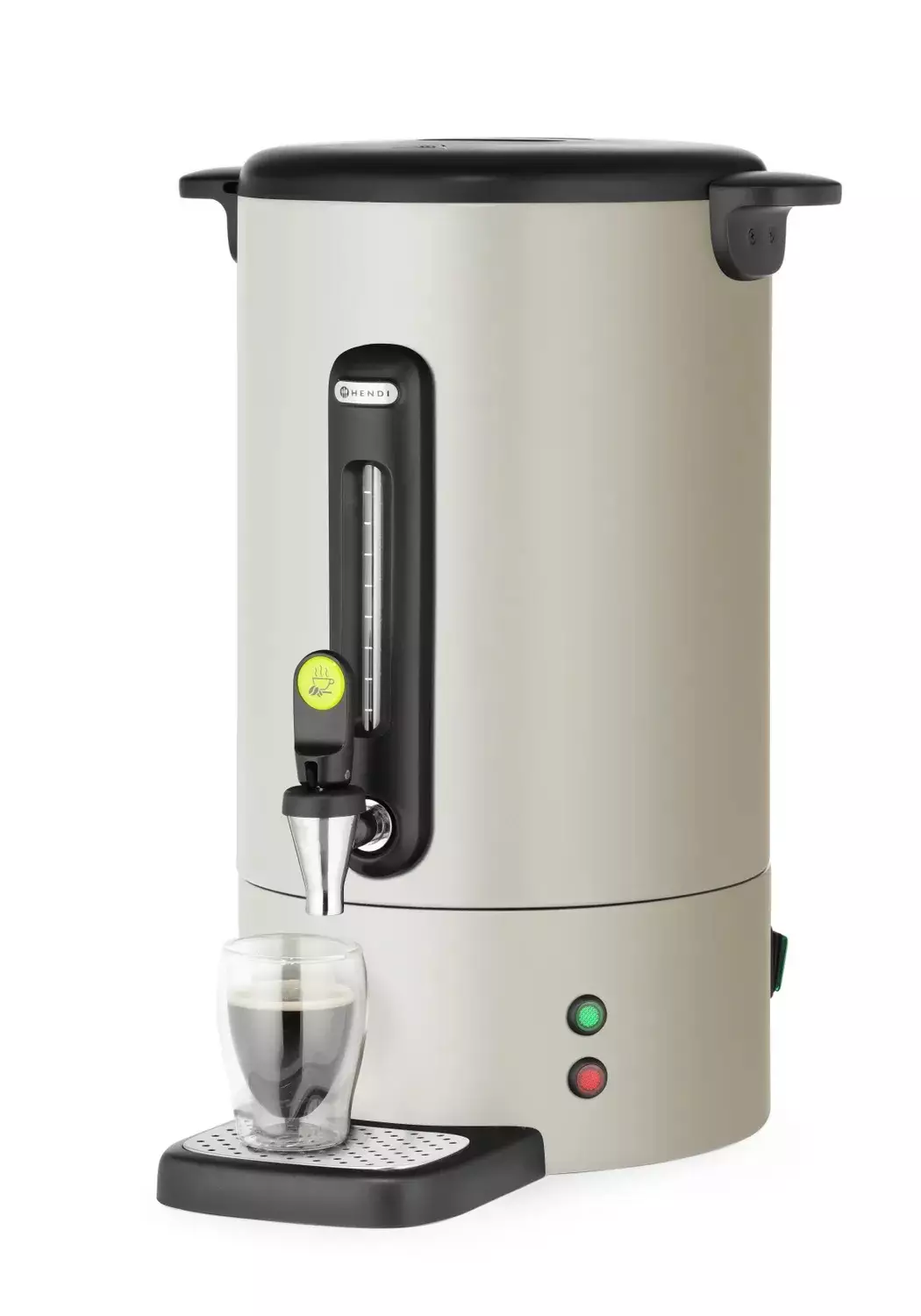 Rungon valkoiseksi sävytetty ruostumaton teräs antaa mattapintaisen, huomaamattoman ilmeen. Tyylikkäät polypropeenikahvat ja tippumaton hana tekevät käytöstä sujuvaa. Korkeintaan 100 mm korkeille kupeille sopiva rakenne toimii monenlaisiin tarjoilutilanteisiin.